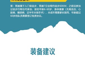 装备:登山杖1根、矿泉水1瓶、一次性雨衣1件、魔术头巾1条;