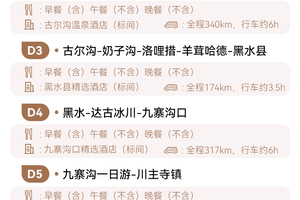 按行程所列标准入住: ①1晚古尔沟温泉酒店②1晚黑水县酒店③1九寨沟口酒店④1晚川主寺镇酒店 |