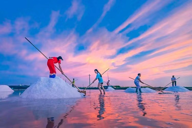 今天我们将前往广东四大盐场之一【徐闻盐场】,拍摄盐工劳作日出,勤劳的盐工仍采用着传统纯手工劳作的制盐工艺,朝霞满天,盐田如镜,结晶池中间的空地上,盐工们正在辛勤劳作。
