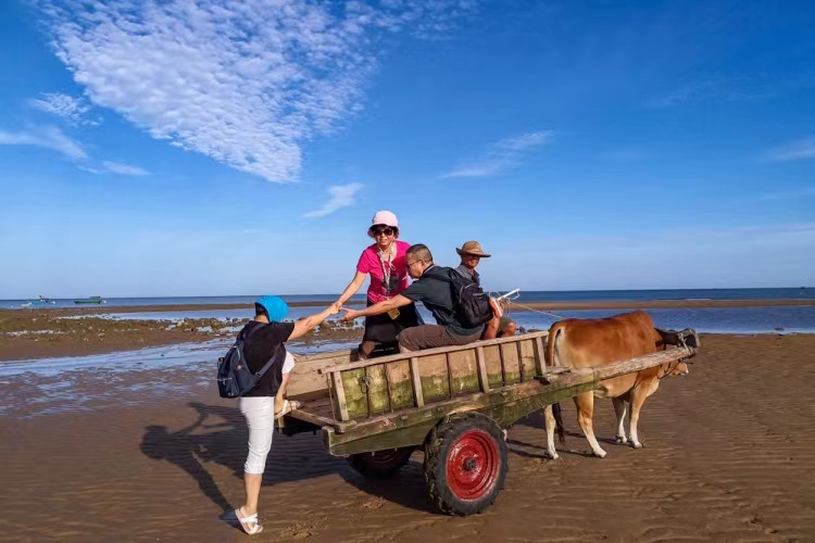 傍晚前往【放坡村】海边拍牛车赶海、灯塔日落。放坡村一带的海滩结实得可以跑汽车,于是充气轱辘的牛车是当地渔民往来岸上和海上渔船的主要运输和交通工具。渔民用牛车可以方便地将渔船所需网具等用品运到海里装上渔船,将渔获或需修补的网具等拉上岸,甚至可以作为人员来往渔船的交通工具,非常独特的人文景观。