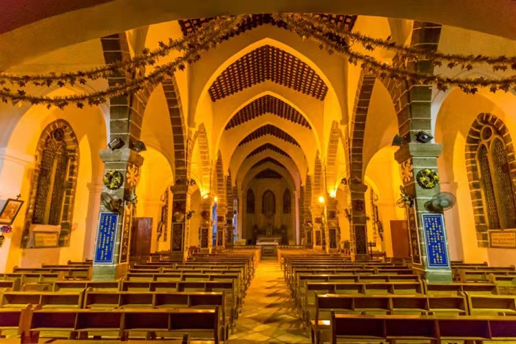 换乘交通车环游海岛,天主教堂、涠洲岛灯塔,五彩滩,贝壳沙滩,滴水丹屏,