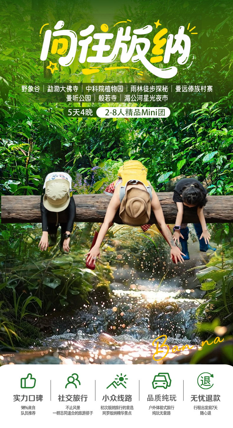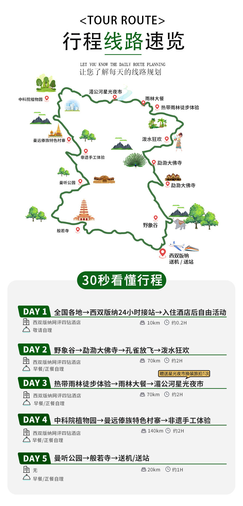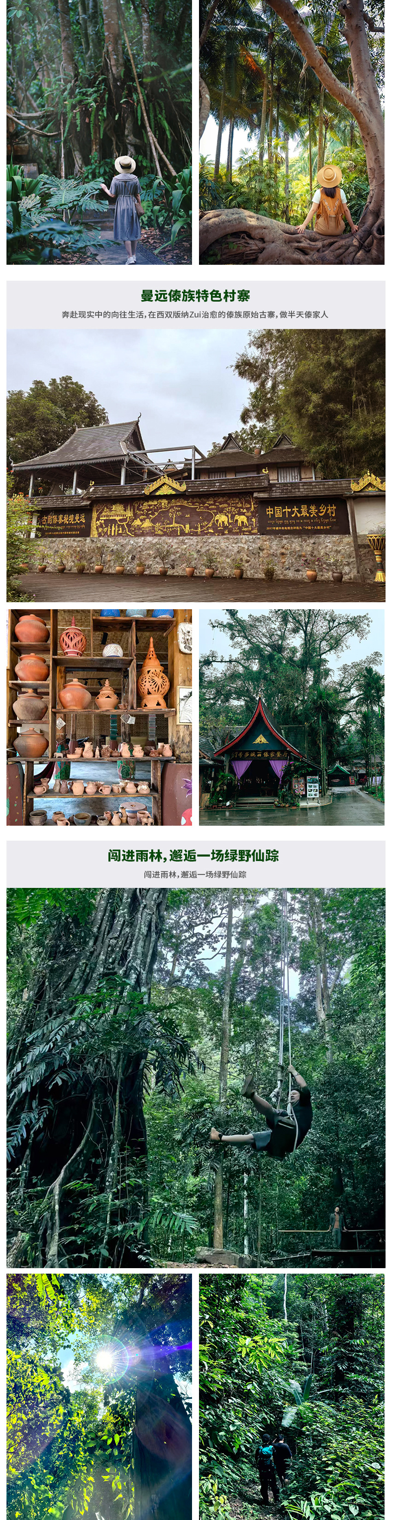 3、景点:行程内所列景点门票(曼听公园、告庄西双景、野象谷、勐泐大佛寺、中科院植物园、雨林徒步体验、曼远傣族古寨);