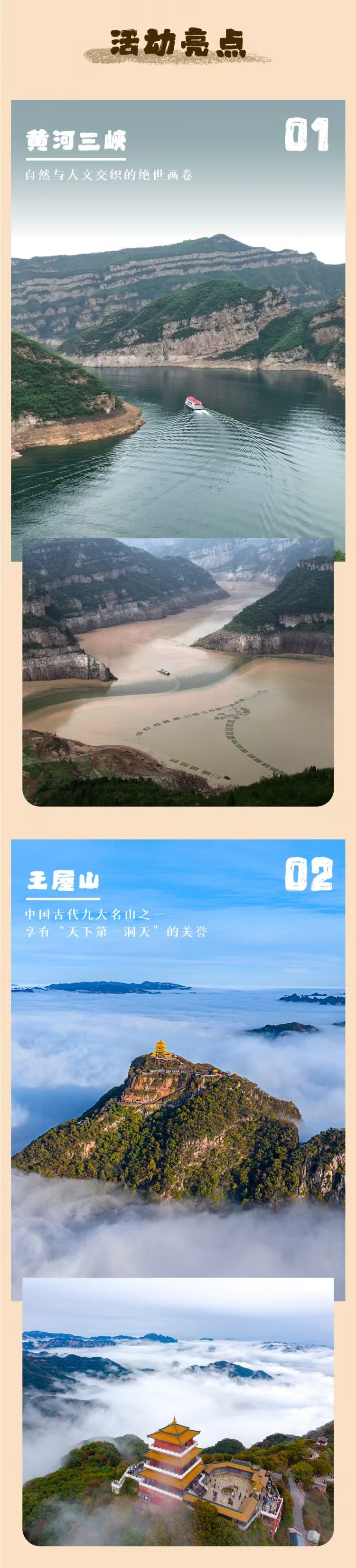 早餐后,前往自然与人文交织的绝世画卷【黄河三峡】,这里峰峦如聚,山水相依,宛如一颗璀璨的明珠镶嵌在大地之上,堪称小浪底的精华之所在。我们将先后乘船、乘索道游览该景区,欣赏这幅山水花卷!