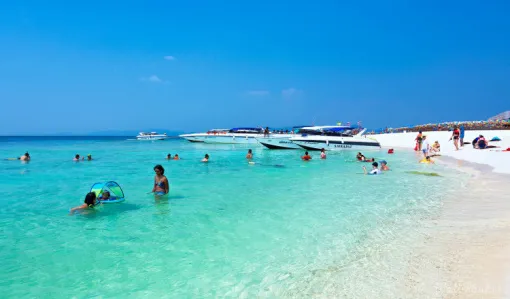 它是欧美人士最爱日光浴的天堂,现在这群热带鱼将热情等待你们的到来。岛上保持着原始生态,无人在岛上居住。是 pp 岛周边海水质量最好的地方。长满了青翠的树木,海水可以看到浅绿深绿深蓝三种不同颜色,沙滩宽阔,洁白细软,沿着海边蜿蜒伸展开来,绵延达数公里。四周被洁白的沙滩和海水围绕,景色美轮美奂!到达岛上你才明白,这个地方绝对是此次普吉岛之行的最美丽的地方。