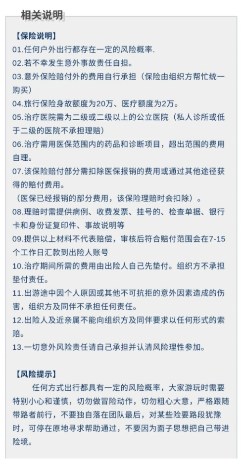 11.健康说明:本次为长途旅行,请游客在报名前仔细阅读相关注意事项,在充分了解旅途辛苦和行程中医疗条件有限的前提下,确定自己身体健康状况适合参加本次旅行后方可报名参团。因个人既有病史和身体残障在旅游途中引起的疾病进一步发作和伤亡,旅行社不承担任何责任。旅行社非健康医疗专业咨询机构,无法判定游客身体健康状况是否适合参加本次旅行,游客签订了旅游合同,即视为游客已经了解本次旅行的辛苦程度和行程中医疗条件有限的前提,并征得专业医生的同意。友情说明:①身体健康状况不佳者,请咨询医生是否可以参加本次旅行,根据自身情况备好常用药和急救药品,因自身疾病而引起的后果,游客自行承担责任;②如在旅途中意外受伤,应及时告知随团导游领队或者签约门市,治疗期间的医疗费用由客人自行承担,再根据保险公司理赔相关规定进行报销。
