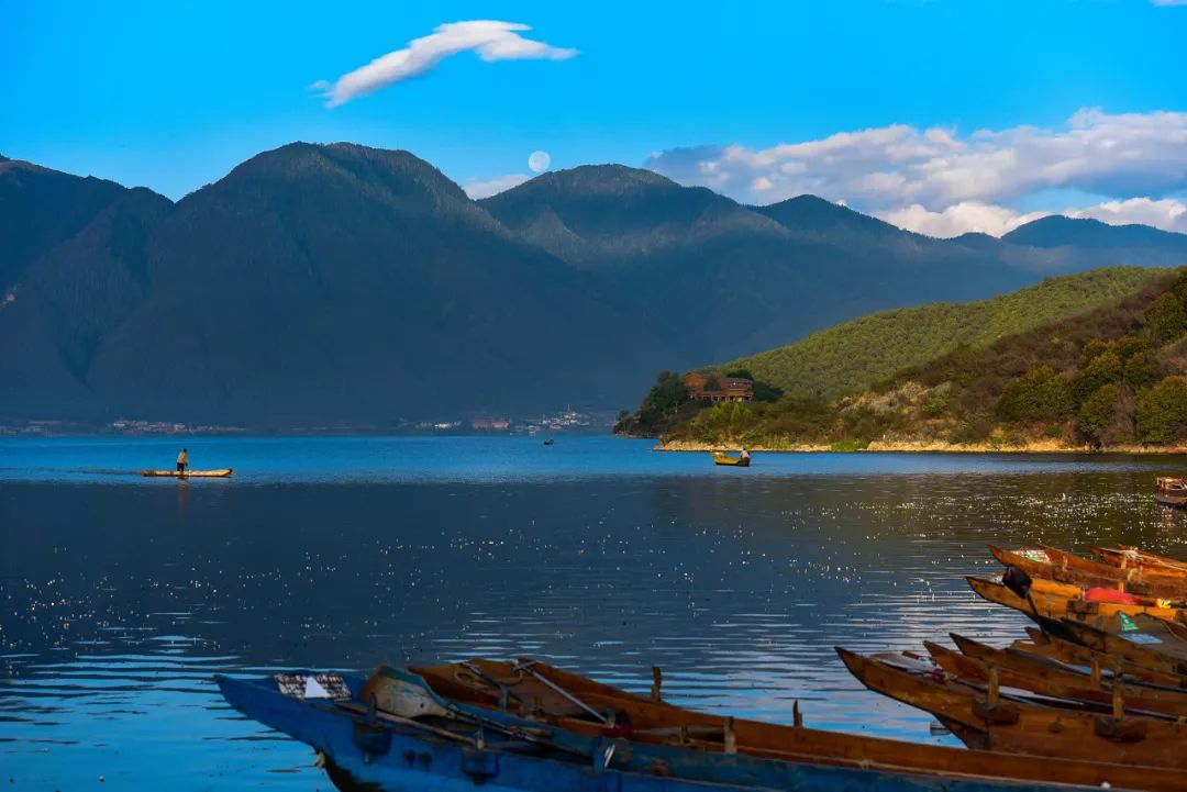 湖光山色的惊艳是视觉的冲击,而山间鸟语,静水生波,以及飘荡在风起涟漪的湖水上的猪槽船,才是泸沽湖的自由底色。