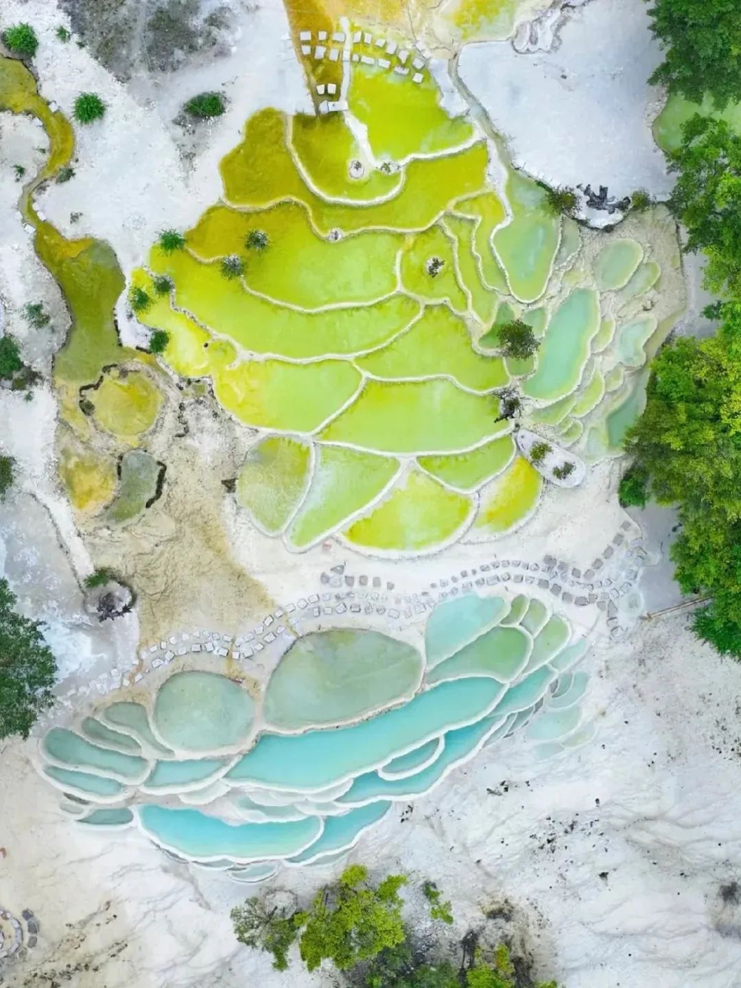 白水台也被称为中国版棉花堡,层层叠叠的白色钙化池,自上而下错落有致,形似高山上的梯田,恰如神仙耕耘的“仙人遗田”。