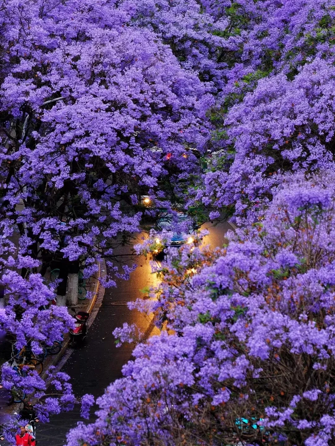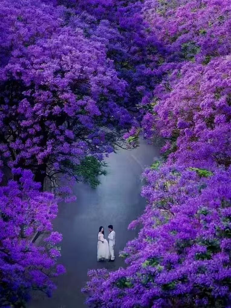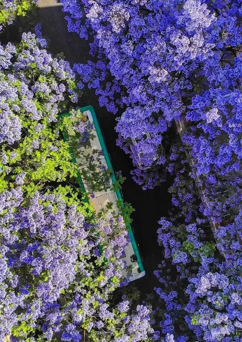 在开满蓝花楹的街道,蓝紫色的花影悄然蔓延,