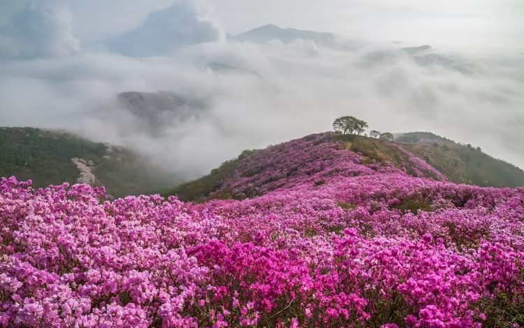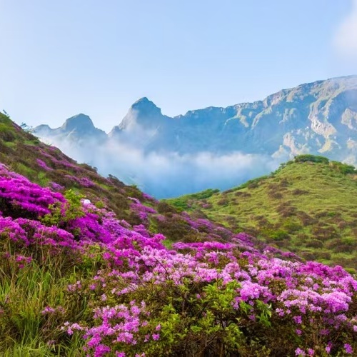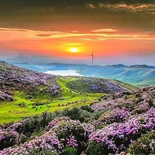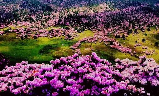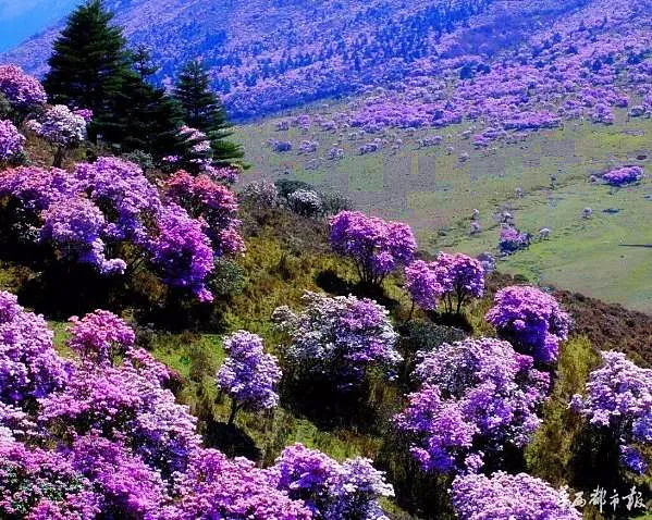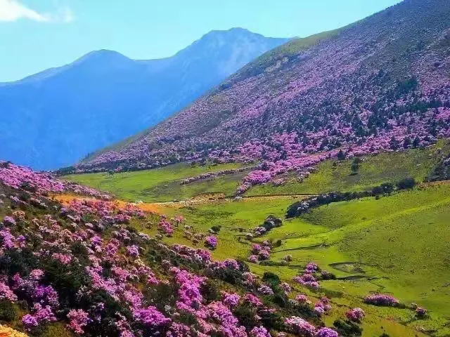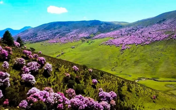 适时前往【七里坝草场】。行驶约40公里的蜿蜒盘山公路顺利到达昭觉七里坝,这里海拔高度近3500米,是一片壮观的高山草甸,生长在这里的杜鹃花品种繁多,包括乔木和灌木。其中,乔木杜鹃以白色、绯红偏多,灌木杜鹃颜色主要为紫色及紫蓝等色。每年4一5月杜鹃花开季节,盛开的【杜鹃花】,山顶高处花儿越多越密开得越艳丽,繁花似锦,铺天盖地,美不胜收。