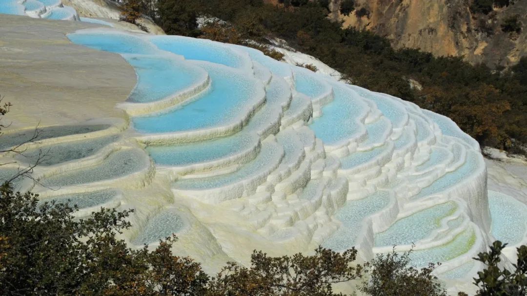 云南有自己的棉花堡,【白水台】海拔约有2380米,其造型酷似一层层梯田。成因是由于水中的碳酸氢钙经太阳光照射,水分蒸发后形成碳酸钙白色沉积物,之后又不断覆盖地表而形成的泉华地,因此是中国最大的泉水台地之一。