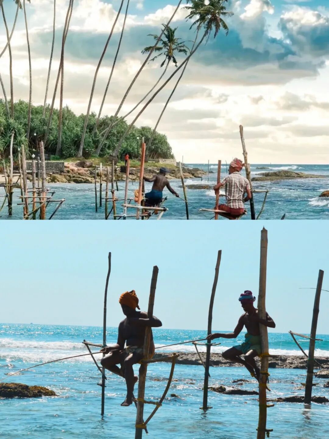 高跷渔夫,斯里兰卡独有的文化体验,来了加勒一定要体验一番,渔民站在或坐在海中的垂直木杆上进行垂钓,也是斯里兰卡的标志性画面之一。