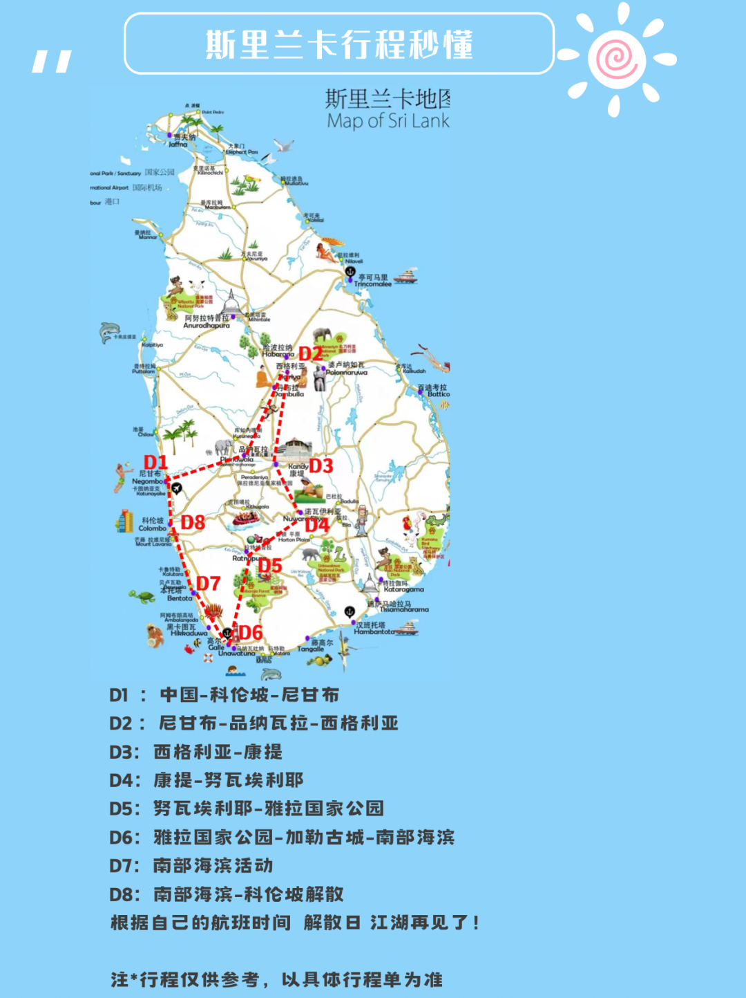 2.斯里兰卡为发展中国家,路况环境正在逐步完善过程当中,游览期间拉车时间较长,建议容易晕车的游客自备晕车药物;行程中所注明的城市间距离,参照境外地图,仅供参考,实际行程时间视当地交通状况为准;