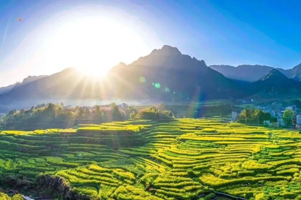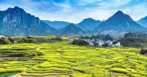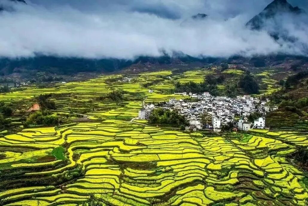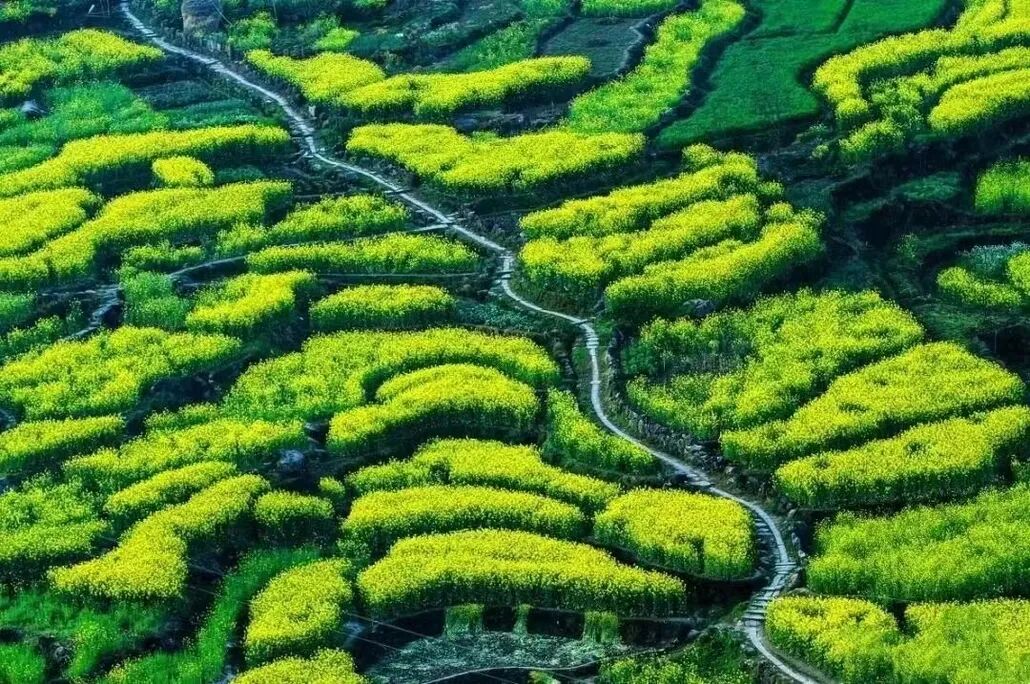 随意找条田埂小道,穿过梯田往山上去。踏上松软又结实的土壤,整个人瞬间放松下来,这是大自然特有的亲切。一层层的梯田从山脚盘绕至山顶,错落有致,蔚为壮观。金灿灿的油菜花绵延几十里,只要风起,油菜花田就化身成蜜的海洋,一道道金色的“闪电”在花海中炸开,深深吸一口花香,好像快醉倒在春风里。